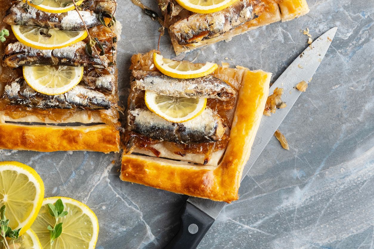 6. Disposez les sardines à l’huile d’olive sur les oignons, en les pressant légèrement dans la garniture.