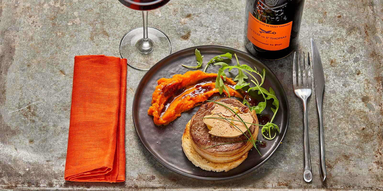 Faites-les griller au grille-pain. Servez alors vos tournedos sur les disques de pain grillé, garnis d’une tranche de foie gras, d’un cordon de sauce et de la purée réchauffée.